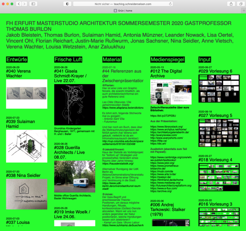 Im ersten Covid-, d.h. Digitalsemester beschäftigen sich 12 Masterstudierende unter dem sehr allgemeinen Oberthema 'Grün' damit, Natur als integralen Bestandteil von Architektur zu denken. Im Widerspruch, dass Natur per Definition nicht vom Menschen geschaffen und somit auch nicht gedacht werden kann, liegt hierbei die besondere Herausforderung.