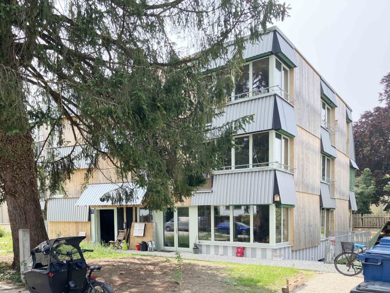 12.09.2024 extension to a 60s building in Berlin, timber frame construction and clay inside, flat roof with greenery and photovoltaic, fuel-cell heating